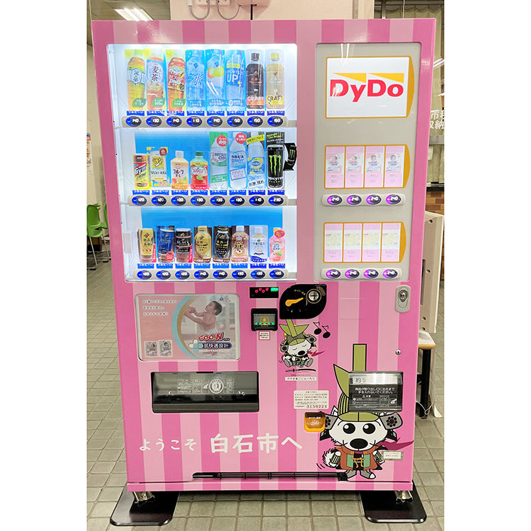 【関西】ダイドードリンコは25日、飲料と合わせてベビー用紙おむつを購入できる「ベビー用紙おむつ自動販売機」=写真=を宮城県白石市役所に設置した。自販機には同市PRキャラクター「ポチ武者こじゅーろう」のイラストを施し、子どもも親しみやすいデザインで、飲料や紙おむつを購入する以外の楽しみも提供する。 同自販機は、気軽に外出を楽しめる環境づくりを推進している白石市に対し、子ども連れの来庁者に安心して施設を利用してもらうことを目的に企画。県内行政機関で初め