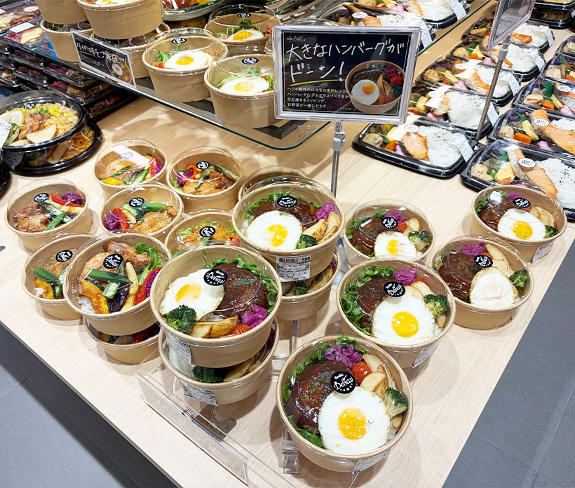 同店はダイエー・光洋で培ってきた食品加工技術や商品開発力、売場づくりの総力を結集。店内はロゴマークに使用しているブランドカラーの「瑠璃色」を生かし上質かつ洗練された印象に仕上げた。同SCの核店舗と
