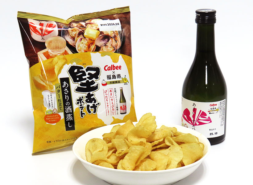 カルビーは27日、福島県と連携した地域課題解決プロジェクトの第3弾として「堅あげポテト あさりの酒蒸しバター仕立て」を宮城、山形、福島の3県で数量限定発売した。同品は会津若松市で江戸時代末期に創業した末廣酒造の純米酒「あまいすえひろ」とのペアリング商品として開発。20代に人気のスナック菓子と日本酒を組み合わせた新たな食べ方提案で、福島県が課題とする若年層の日本酒離れ解消を図る。