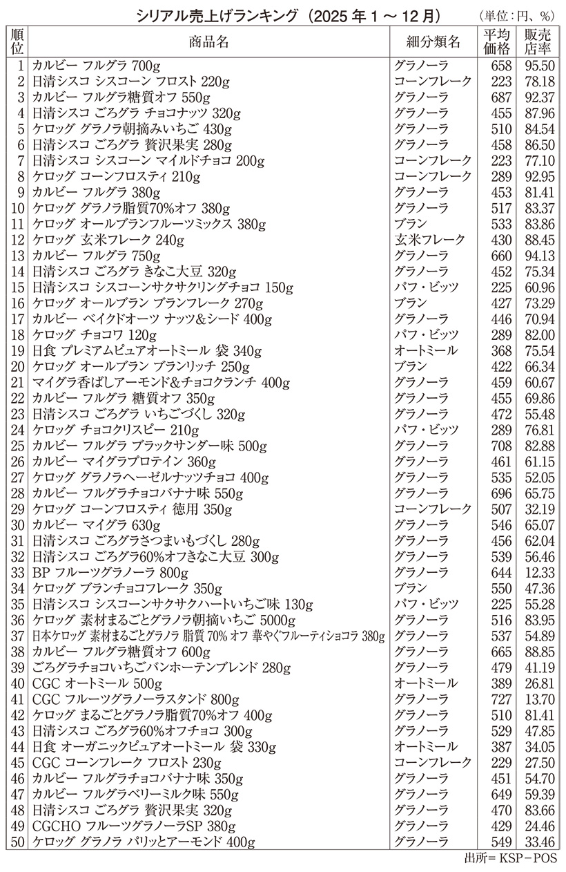 パン・シリアル 特集 2026.03.30カルビーのシリアルカテゴリーは、主力ブランド「フルグラ」を軸とした商品施策とコミュニケーション強化により引き続き堅調に推移している。25年は2月に規格改定を実施したものの、4月以降は新商品の継続投入や商品増量施策を展開し需要の維持・拡大を図った。その…続きを読む