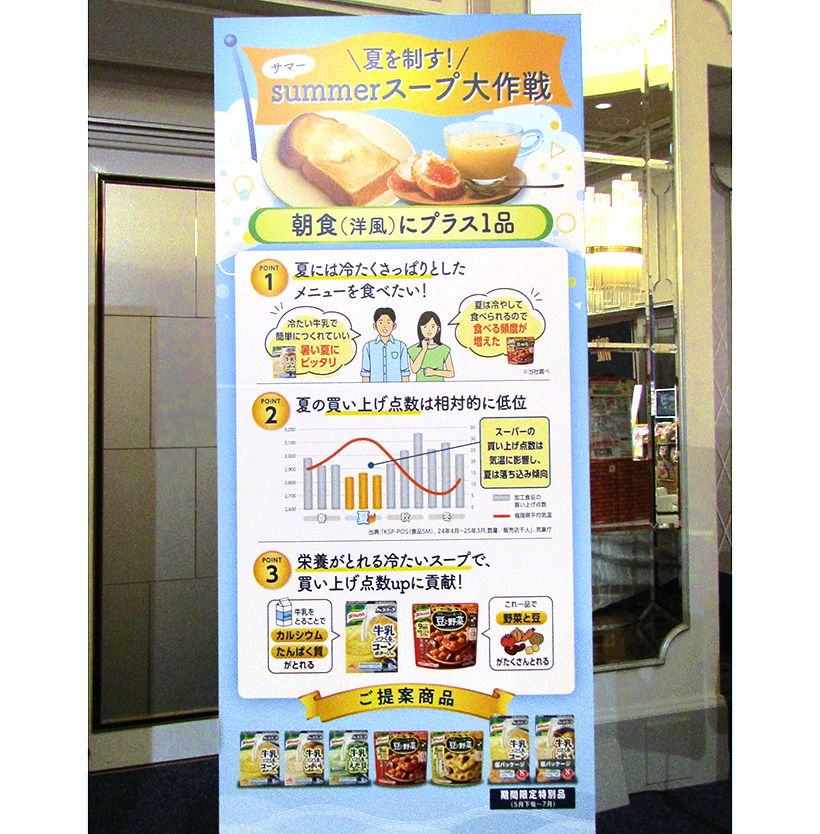 【九州】味の素九州支社は春夏向けで、「暑さの定番化」を踏まえた提案を強化している。昨年夏、九州の得意先で「ポタージュで食べる豆と野菜」シリーズを、「牛乳でつくる」シリーズとセットで提案した。「ポタージュで食べる豆と野菜」シリーズは、スープカテゴリーで特に堅調な商品群。もともと、レンジアップ商品として打ち出してきた。ただ、冷やして楽しむことも可能。そこで、冷製スープ全体で訴求したところ、店頭で売場が実現。売れ行きが堅調だったとしている。今年の春夏では、採用企業増を目指す。加え