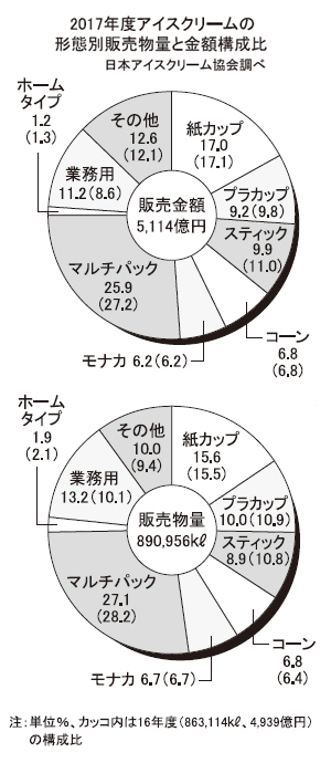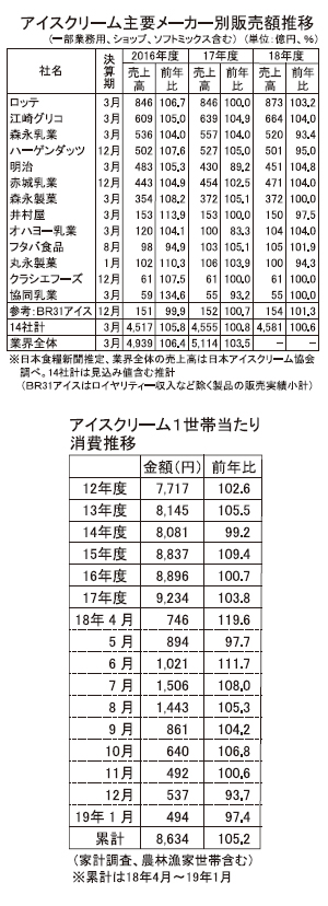 2018年度(18年4月~19年3月)のアイスクリーム市場は、5000億円を突破した17年度を上回り、前年比1~2%増の過去最高規模での着地が見込まれる。今年度は夏場6~8月にかけて記録的な猛暑に見舞われ、需要が供給を上回る事態も発生した一方、ゴールデンウイークの天候不順や9月に入ってから度重なる台風の直撃、自然災害の多発に見舞われるなど、気温・気候の変動に大きく左右された1年でもあった。迎える19年度は、3月1日出荷分から始まった価格改定の影響が大きく注視される。