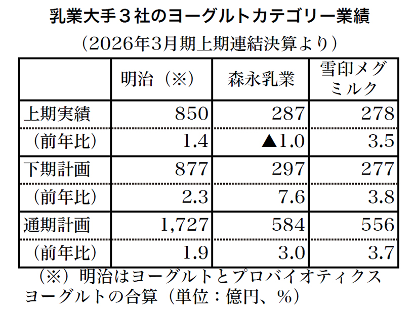 明治、雪印メグミルク、森永乳業の乳業大手3社の2025年度中間決算が出そろった。3社とも多くのカテゴリーで価格改定を実施したが、数量面では依然として大きな回復はみられていない。ただ、ヨーグルトカテゴリーは上期からそれぞれマーケティングやプロモーション戦略、さらに容量戦略などで独自の強みを発揮しており、下期以降も市場は盛り上がりそう。市場が活性化することで、昨今業界課題となっている脱脂粉乳(無脂乳固形分)の過剰在庫削減にもつながることが期待される。(小澤弘教)