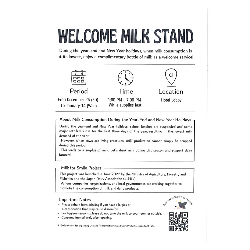 リソルが運営するツーリストホテル「リソルホテルズ」は25年12月末から、全国20ホテルで「welcome milk stand(ウェルカムミルクスタンド)」を行っている。JA全農とコラボし、不需要期に当たる年末年始に、200ml入りの牛乳約7000本、総重量1.4tを宿泊客に無料提供。3ヵ国語表記のパンフレットも用意し、需給ギャップの周知なども図り、14日まで実施する。
