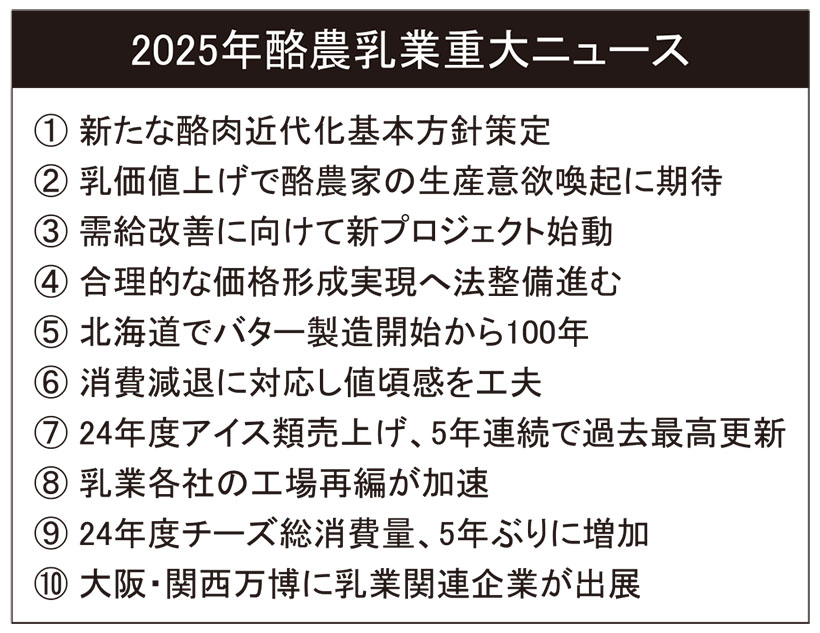 乳製品 牛乳・乳飲料 特集 2026.01.21●生産基盤の構築・維持 昨年のわが国の酪農情勢を振り返りますと、8月にはコロナ禍以降3度目となる乳価値上げが行われ、経営改善に向けた明るい兆しが見られました。生産資材やエネルギー価格は依然として高止まりしているものの、酪農現場では生産性向上や効率化…続きを読む