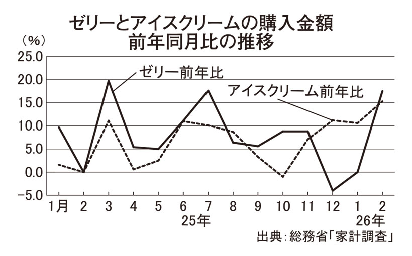 近年、常態化し長期化する猛暑。その中でかねてハイシーズンをつかんできたのがアイスクリームとゼリーだ。暑さを和らげ、清涼感を与える両アイテムだが、消費金額こそ開きがありながら、購入比率に変化が見えてきた。背景には物価高や生活スタイルの変化があると考えられるが、最近では、両カテゴリーの「いいとこ取り」ともいえるハイブリッド商品も海外から上陸。若年層を中心に早くも話題となっており、夏場の両カテゴリー戦線のトリックスター的存在になる可能性が高い。