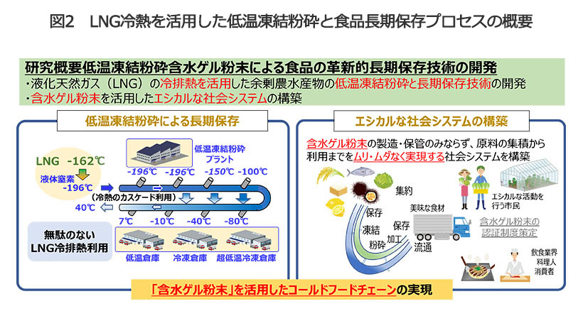 近年、食品分野ではフードロスの削減と持続可能な供給体制の構築が重要な課題となっている。農林水産省のデータによれば、収穫されながら出荷されていない農水産物が毎年一定量存在しており、その一因は需給バランスの調整にある。また、液化天然ガス(LNG)の利用過程で生じるマイナス196度Cの冷熱も十分に活用されていない未利