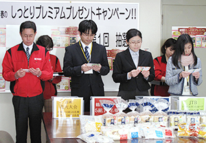 【北海道】日糧製パンは9日、「日糧春のしっとりプレミアムプレゼントキャンペーン!!」の第1回抽選会(写真)を行った。