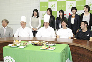 記者会見に臨む池田隆幸教授(左端)と学生、シェフら