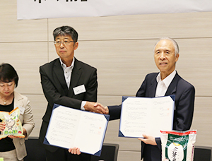 協定調印式で握手する雑賀慶二東洋ライス社長(右)と庭野吉也東都生協理事長