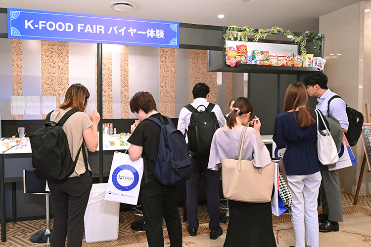 韓国農水産食品流通公社は15日、東京都港区のグランドプリンスホテル高輪で「K-FOODフェア2023inTokyo」を開催した。日本での韓国人気が高まる中、新たな販路を求めるメーカー42社、商社15社が出展し、来場バイヤーと活発な商談を繰り広げた。体験型商談会でもあり、韓国伝統菓子やスナック菓子、カップ麺、黒ごまやサツマイモなどを配合したラテ、韓国茶などの試飲・試食体験コーナーが設けられ、にぎわいを見せた。 商談コーナーの入口には、韓国食ニュースを