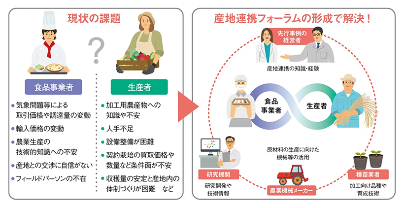 ●最新業界情報の提供やオンラインセミナーも充実 食品事業者と生産者を中心とした広域連携を支援するWebサイト「産地連携フォーラム」が立ち上がった。愛称「MARRIAGE」と称するこのサイト、農林水産省の事業受託社としてジェイエイ情報サービスが運営。「互いを知り、互いを支える」をテーマに、食品事業者と生産者が抱える経営課題の解決を目指す。 食品事業者の国産原材料安定調達、生産者の販売先確保を実現するため、先行して取り組む経営