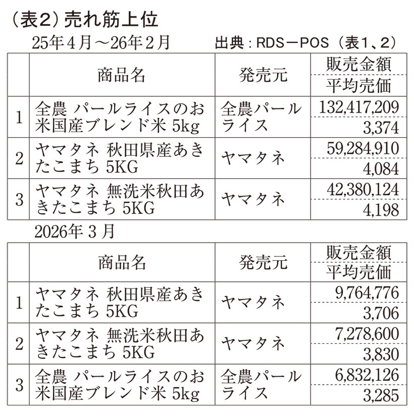 店頭で5kg3000円を割り込む特売も目立つなど、コメの値下がりが3月から本格化し、販売数量が回復し始めた。スーパーの販売状況を、RDS-POS(マーチャンダイジング・オン社)の全国スーパー実績(表1)で見ると、平均単価は昨年11月から毎月下落。前年同月比では、12~2月は各月とも同20%台の高値が続いていたのに対し、3月は同1.5%高と、ほぼ前年並みに戻っている。これが販売数量に影響し、1月は同14.6%、2月は同12.6%も減少したのに対し、値下がりが本格化した3月は同1