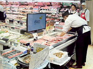 ダイエーは、東京都港区のグルメシティー麻布店を大幅に改装し、「ダイエー麻布十番店」として8日、リニューアルオープンした。都市型食品スーパー(SM)への改装は今期6店舗目となる。同店は30~40代の働く単身世帯、小世帯家族層をメーンターゲットに、「生鮮・中食商品」「高質・こだわり商品」を強化し、15年度に年商15億円を目指す。ダイエーでは、年内にさらに4店舗を都市型SMに改装する計画。  松下桂充店長は「都市型スーパーとして、高密度・高回転を目指し、狭
