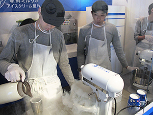 江崎グリコは13日まで、ベーカリーカフェ426表参道(東京都渋谷区)で、作りたての「牧場しぼり」を味わえる期間限定ストア「できたてアイス専門店 新鮮ミルクのアイスクリーム屋さん」を開店している。液体窒素を使って新鮮ミルクをその場で調理する「できたて牧場しぼり」を販売。牧場風の内装を施した飲食エリアも備え、喧噪(けんそう)を離れたくつろぎの空間とおいしい時間を提供する。 同ストアで販売する商品は、イートインメニュー(500円)、テークアウトメニュー(