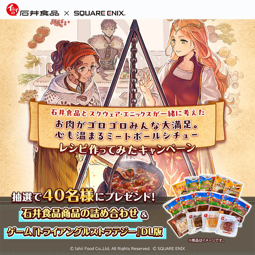 石井食品は17日、スクウェア・エニックスとコラボレーションし、同社から発売中のタクティクスRPG「トライアングルストラテジー(TRIANGLE STRATEGY)」内に登場する料理を再現したコラボレシピを公開した。ゲーム業界とのコラボは初の試み。同日から抽選で石井食品商品の詰め合わせなどが当たるSNS投稿キャンペーンを開始。コンテンツやコミュニティーを通じた新しい顧客接点の創出を目指す。 今回のコラボレシピは同ゲーム発売4周年を記念したもの。石井食