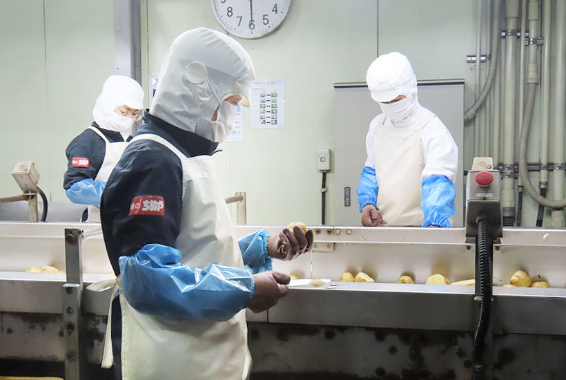 ジャガイモは大小選別後、必要に応じてカット・トリミングを行う