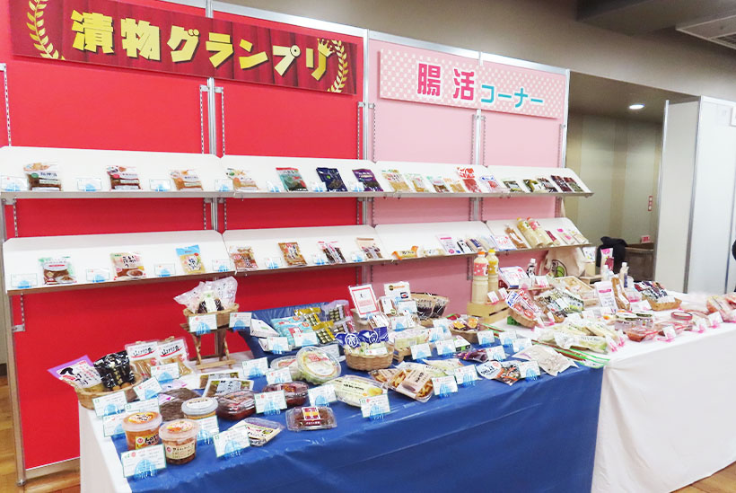 「漬物グランプリ」コーナー(左)と「腸活」コーナー。前者では過去の受賞商品を紹介