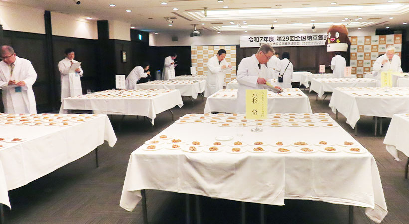 全国納豆協同組合連合会(納豆連)は11月21日、「第29回全国納豆鑑評会」を郡山ビューホテルアネックス(福島県郡山市)で開催した。福島県では2005年の第10回から約20年ぶりの開催となる。出品メーカー68社、出品総数176点の中から最優秀賞・農林水産大臣賞には高丸食品(愛知県)「国産中粒納豆 伝説」が選出され、同社は初の4冠を達成した。そのほか特別優秀賞・福岡県知事賞や優秀賞・農林水産大臣官房長賞など計21点が受賞。26年の第30回は愛知県名古屋市での開催を予定する。