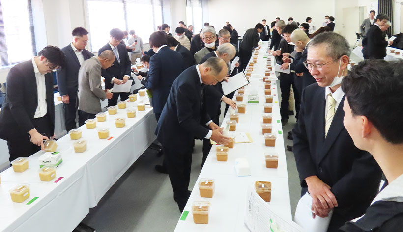 中央味噌研究所は11月20日、「第66回全国味噌鑑評会」で入賞した味噌の公表と表彰式を東京都内で実施した。最優秀賞に当たる農林水産大臣賞は村田味噌「むらた蔵白みそ」や盛田「名古屋八丁みそ」など計6点に授与された。同日には出品味噌すべての一般公開展示も実施。メーカー開発者や公設試験研究機関の審査員ら計103人が来場し、入賞品を中心に出品味噌の色や風味の確認、情報交換などを行った。