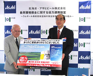 【北海道】アサヒビール北海道統括本部は6月26日、道内12ヵ所のサムサール条約登録湿地の保全事業のため北海道環境財団への寄付金768万円の贈呈式を行った。アサヒビールは今年から「うまい!を明日へ!」プロジェクトとして自然や環境、文化財などの保護・保全活動に取り組み、スーパードライ1本につき1円を寄付する。北海道統括本部は3月下旬~4月下旬に実施し、約768万本分、寄付金総額768万4618円となった。 谷田部二郎統括本部長は「4月に北海道と締結した