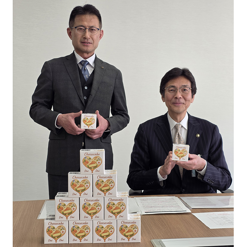 2月27日に熱海市役所で開催された市長定例記者会見で、「熱海産だいだいチーズケーキの開発」について発表。齊藤栄熱海市長(右)と高橋典裕国分中部執行役員