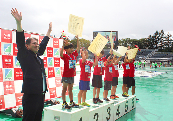 古山利昭ヤマザワ社長(左端)と小学生ランナー