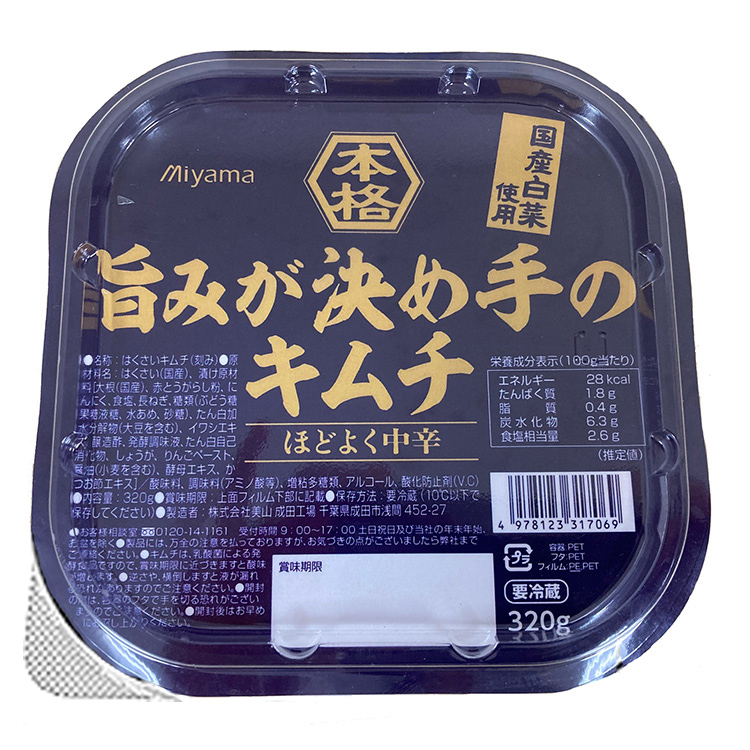 美山は、「旨みが決め手のキムチ」=写真=を9月上旬に発売した。 昆布とカツオ、魚介の3種の成分を重ね合わせた、コクのあるうまみが決め手のキムチで、厳選した風味豊かな唐辛子を使用し辛味を増している。うまみと味のバランスの良さが特徴だ。内容量は320g、価格はオープン。(菅田一英)