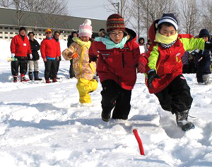 【北海道】都市と農業をつなぐ田園テーマパーク・サッポロさとらんどで2日、「2013年福島キッズinさっぽろ雪まつり」が行われ、地元札幌の子どもたちと雪中運動会=写真、サッカー、アトラクションなどで楽しんだ。 このイベントは、福島県川内村(福島第1原発から約20km)の小中学生18人と札幌の子どもたち20人が冬の北海道体験を通じて交流を図ったもの。主催は国際ロータリー第2530地区(福島)、国際ロータリー第2510地区(北海道西部)、札幌北ロータリー