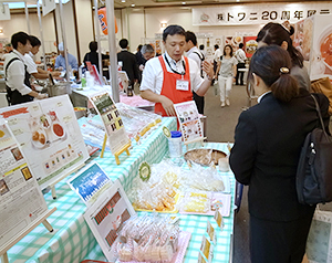 【北海道】トワニは8月28日、札幌パークホテルで「トワニ20周年展示会」(写真)を開き、小売、外食、中食、給食関係者ら約700人が来場した。 展示会では「食提案と美味しさの創造」をコンセプトに提案と試食コーナーを充実、試食フードコート、提案コーナー、メーカー展示コーナーで構成。会場入り口に、トワニのルーツである食品添加物卸・三香商会(1949年創業)と協和食材(65年設立)の沿革、両社が95年に統合して「トワニ」を設立して道内ネットワークを構築した