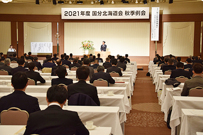 【北海道】国分北海道会は11月30日、京王プラザホテル札幌で第8回秋季例会=写真=を開催し、食品、酒類、低温、菓子などの会員企業から約200人が出席した。 小野寺哲也会長(サッポロビール北海道本部、上席執行役員北海道本社代表兼本部長)は冒頭、「1~10月の家庭用市場は巣ごもり需要が落ち着き食品で前年並み、酒類2.5%増と推定される。一方、業務用は全体で30%減、2019年比で60%減と厳しい。ただ11月単月でみると前年比40~50%増、19年比でエ