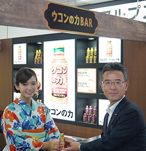 具体的には(1)では7月4~17日まで、JR新宿駅のアルプス広場をジャック。壁面広告出稿や期間限定(7月8、9、15、16日)で「ウコンの力BAR」をオープン。全5品を発売しタレントのにわみきほが写ったオリジナル紙うちわを配布。さらにレバープラス粒タイプ(試供品)を数量限定で配布した。9日には「酒場放浪記」の吉田類が「ウコンの力BAR」に来店し、会場を盛り上げた。