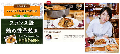 第1回はフランス語編=写真=で12日に公開を開始。ナビゲーターは女優の松本穂香。「フランス語×鶏の香草焼き」をテーマに、東京・虎ノ門の人気店「ル・プティ・トノー」でシェフのフィリップ・パットンが「鶏の香草焼き」に欠かせないハーブや作り方をフランス語で紹介している。
