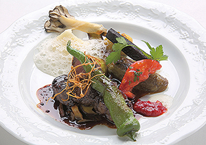 【エゾ鹿肉のロースト 季節の野菜ときのこを添えて】北海道・白糠産のエゾ鹿肉を使用。クセも臭みもなく、脂のうまみも実感できる