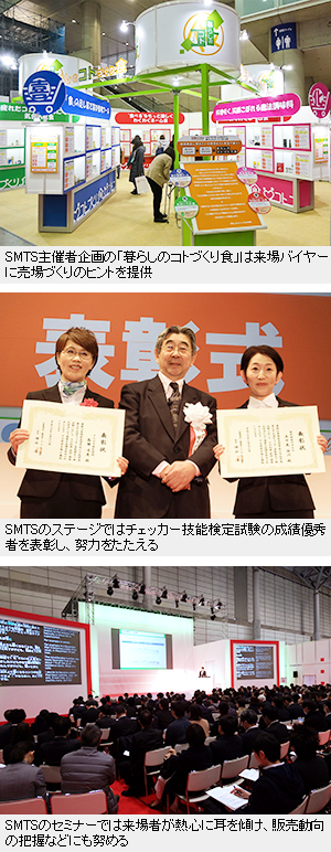 ●多彩な提案で課題解決を SMTSはNSAJの前身の一つ日本セルフ・サービス協会が64年に第1回のセルフ・サービス・フェアの開催を皮切りにスタートした。 91年には第25回を記念して名称を変更して「スーパーマーケット・トレードショー」として広く認知されている。今年で52回を数え、来年2月には第53回を迎える。 SMTSは商品の展示だけでなく、主催者企画やさまざまなセミナーなどで、業界の最新動向や消