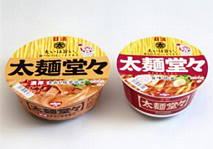 日清食品は、「日清食品最太麺」を実現した「日清 太麺堂々 濃厚煮出し豚骨醤油」=写真左=、「日清 太麺堂々 旨味醤油」=写真右=を19日に全国で新発売する。 同社では、10年のマーケティングテーマを“太さでうまさを、ぶっちぎれ”とし、新たなブランド横断プロジェクト〈2010沸騰太麺宣言 太さで、次ぎのうまい!をつくりだす〉を展開している。 今回発売する商品のコンセプトは「麺の新技術(特許取得済)を使用した極太フライ麺と、そ