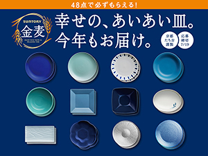 サントリービールは、「金麦」「金麦〈糖質75%オフ〉」「金麦クリアラベル」を対象に、「幸せの、あいあい皿。今年もお届け。」キャンペーンを全国で実施している。“必ずもらえる”マイレージ型キャンペーン。