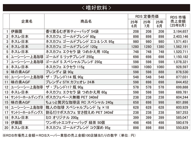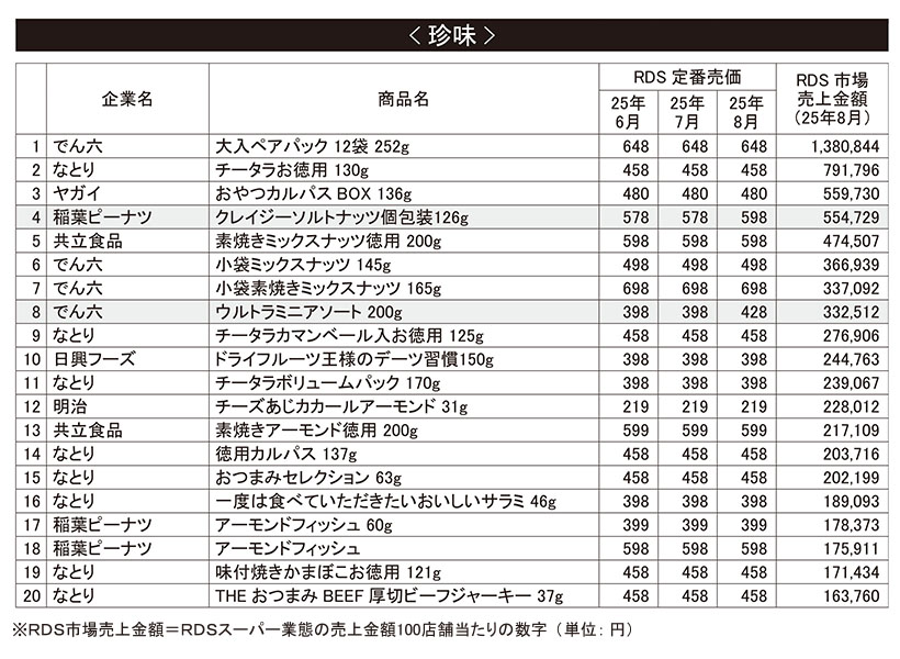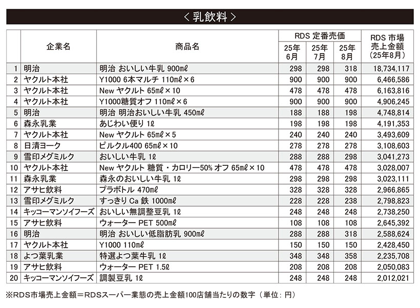「RDS」=マーチャンダイジング・オン社が運営するスーパー、ドラッグストアなど、325企業6325店のPOS情報から集計された市場データサービス * マーチャンダイジング・オン社は独自のロジックで、RDSスーパー業態の全収集店舗197企業約4300店舗から、最高価格をベースに企業ごとの定番価格を推定し、同様に全参加企業ごとに算出した結果から、全国の定番売価を公開している。 ここでは、毎月1回本紙が