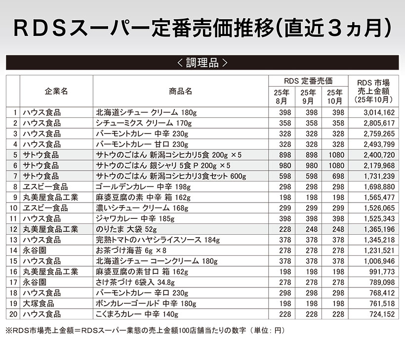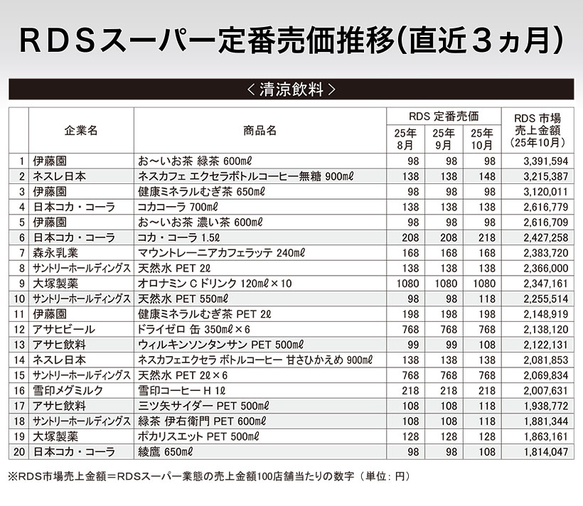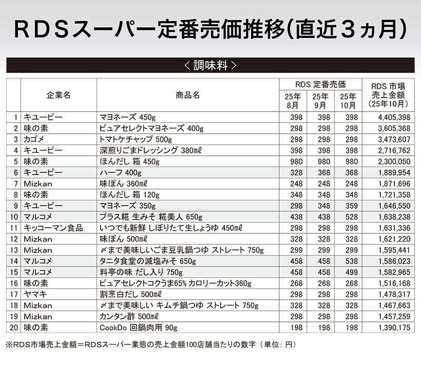 「RDS」=マーチャンダイジング・オン社が運営するスーパー、ドラッグストアなど、325企業6325店のPOS情報から集計された市場データサービス * マーチャンダイジング・オン社は独自のロジックで、RDSスーパー業態の全収集店舗197企業約4300店舗から、最高価格をベースに企業ごとの定番価格を推定し、同様に全参加企業ごとに算出した結果から、全国の定番売価を公開している。 ここでは、毎月1回本