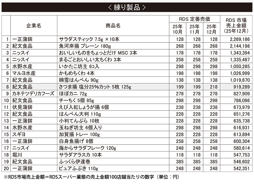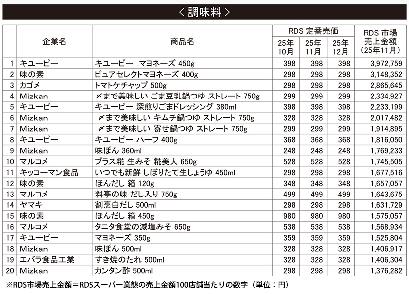 「RDS」=マーチャンダイジング・オン社が運営するスーパー、ドラッグストアなど、325企業6325店のPOS情報から集計された市場データサービス * マーチャンダイジング・オン社は独自のロジックで、RDSスーパー業態の全収集店舗197企業約4300店舗から、最高価格をベースに企業ごとの定番価格を推定し、同様に全参加企業ごとに算出した結果から、全国の定番売価を公開している。 ここでは、毎月1回