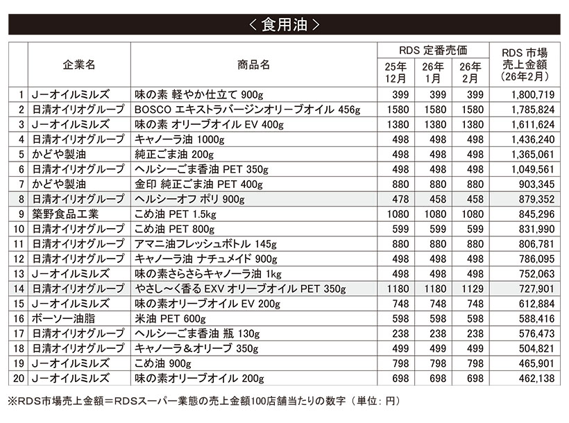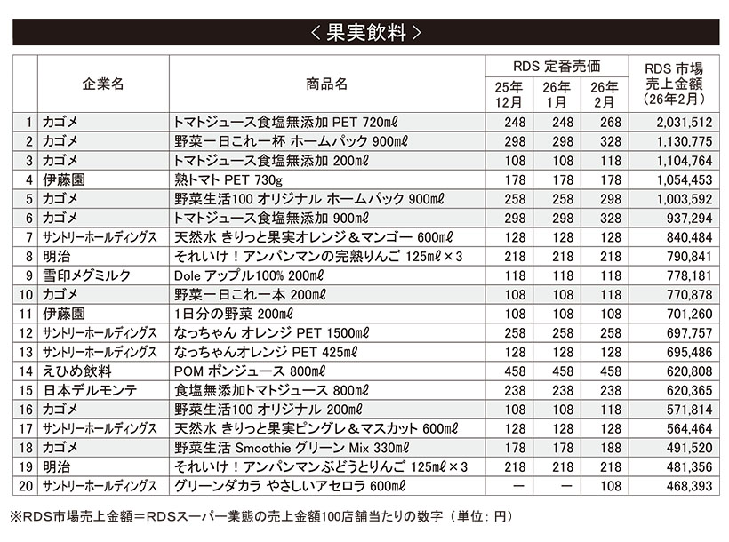 「RDS」=マーチャンダイジング・オン社が運営するスーパー、ドラッグストアなど、325企業6325店のPOS情報から集計された市場データサービス * マーチャンダイジング・オン社は独自のロジックで、RDSスーパー業態の全収集店舗197企業約4300店舗から、最高価格をベースに企業ごとの定番価格を推定し、同様に全参加企業ごとに算出した結果から、全国の定番売価を公開している。 ここでは、毎月1回