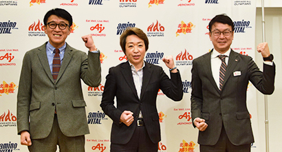 【北海道】北海道味の素は12日、札幌エクセルホテル東急で「北海道『勝ち飯』オリジナルメニュー発表会」を開催。松本征之北海道味の素社長、橋本聖子北海道オール・オリンピアンズ代表、鈴木靖同GM(ゼネラルマネージャー)が出席した。 「勝ち飯」は味の素が2003年にスタートした選手強化プロジェクト「VICTORY PROJECT」の栄養プログラムとして、「何のために食べるか」をベースに食事と補食を考えるもの。北海道味の素では昨年2月に地域独自の取組みとして