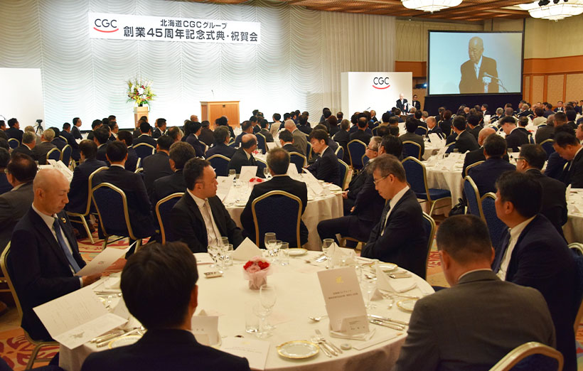 【北海道】道内スーパー9社が加盟する北海道CGCは9月25日、札幌パークホテルで「北海道CGCグループ創業45周年記念式典・祝賀会」=写真=を開催し、道内外から加盟企業や取引先メーカーなど387人が参加した。 式典で北海道シジシーの横山清代表取締役社長(アークス代表取締役会長CEO)は「人生の半分である45年を北海道CGCと過ごしてきた。1社でできないことはしっかりと手を結んで、2社、3社でやっていく協業がCGCグループの肝。たとえ北海道の人口が半