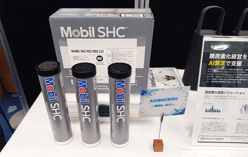 スタンダード石油大阪発売所は、14日に大阪産業創造館(大阪市中央区)で開催された「食品加工技術展2025」に出展し、環境型除菌洗浄剤「レノグリーン」、食品機械用の高性能合成潤滑油「モービル SHC シーバス」シリーズ、99%再生材ゴミ袋「FUROSHIKI」などで、食品製造に携わる企業に「機械安定稼働」「脱炭素経営支援」の提案を行った。