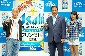 アサヒビールは13日、東京・青山のスパイラルホールで14日から全国で発売したプリン体0.00、糖質ゼロの発泡酒「スタイルフリー プリン体ゼロ」のCM発表会を開催した。新CMにはタレントの所ジョージと森高千里を起用し、健康を気にする世代に向けて訴求していく。