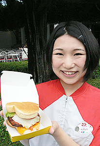 「トゥモローランド・テラス」は、ミッキー型のバーガーなどが食べられる園内唯一のハンバーガーレストラン。豊富なメニューはもちろん、広々としたダイニングエリアも自慢だ。 「ミッキーブレッドサンド」はチーズ&ビーフパティサンド、エッグ&ビーフパティサンド、チキンデリサンド=各580円を揃えている。 働き始めて3年の金井優紀さんは、幼稚園のころから抱いてきたディズニーランドのキャストになる夢をかなえるために上京。以来ゲストに笑顔を