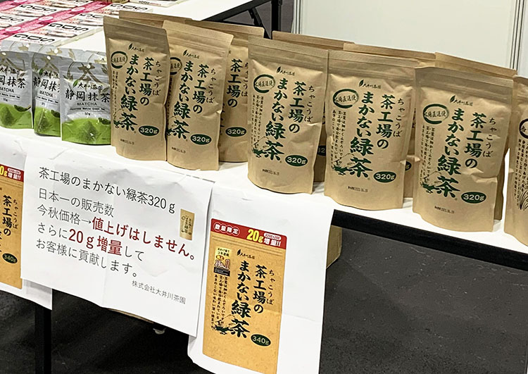 【静岡】大井川茶園は消費者に一層貢献するため、今秋は「茶工場まかない緑茶(320g)」=写真=の販売価格を据え置くのと同時に、内容量をさらに20g増量して販売すると発表した。資材やエネルギー価格の高騰が続く中、同社は調達先を厳選することでコストの抑制に、引き続き努めていくとしている。 なお、全国のスーパーマーケットなどの棚に陳列されている同品は、累計1000万袋を販売しており、伸長を続ける同社の業績をけん引している。(宇佐見勇一)
