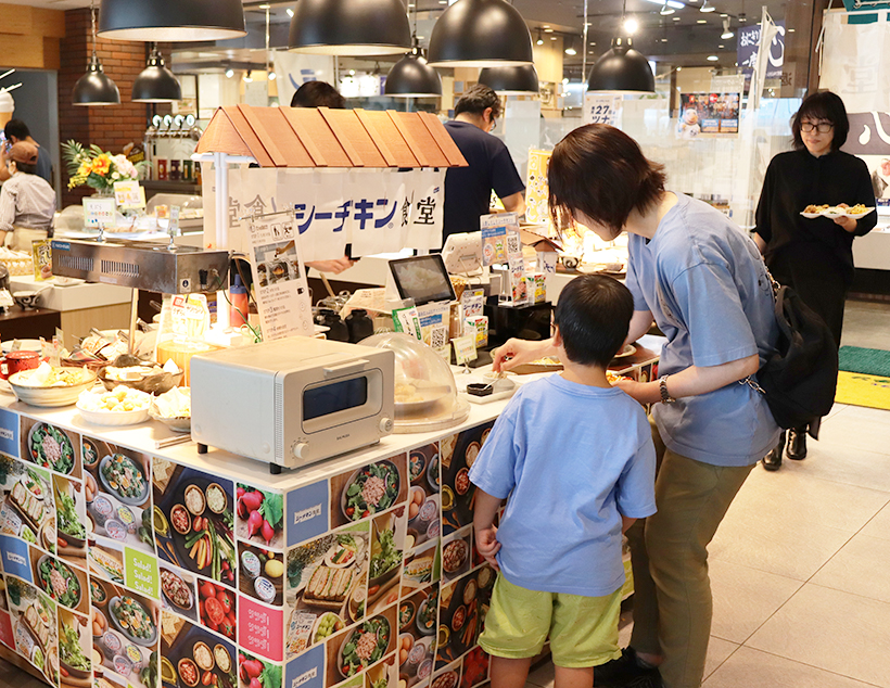【静岡】はごろもフーズは9月20、21日の2日間限定で、清水港近郊にあるエスパルスドリームプラザ(静岡市清水区)内ビュッフェ形式レストラン「はとばキッチン」とのコラボ企画「シーチキン食堂」を開催した。多くの親子連れや観光客などが来店。看板商品「シーチキン」や「Carboff(カーボフ)」などを使った約35種類のコラボメニューのほか、今回新たに用意された8月新発売の「旨海シーチキン」3種を含むシーチキン計7種の食べ比べができる「シーチキンBar」を楽しんだ。