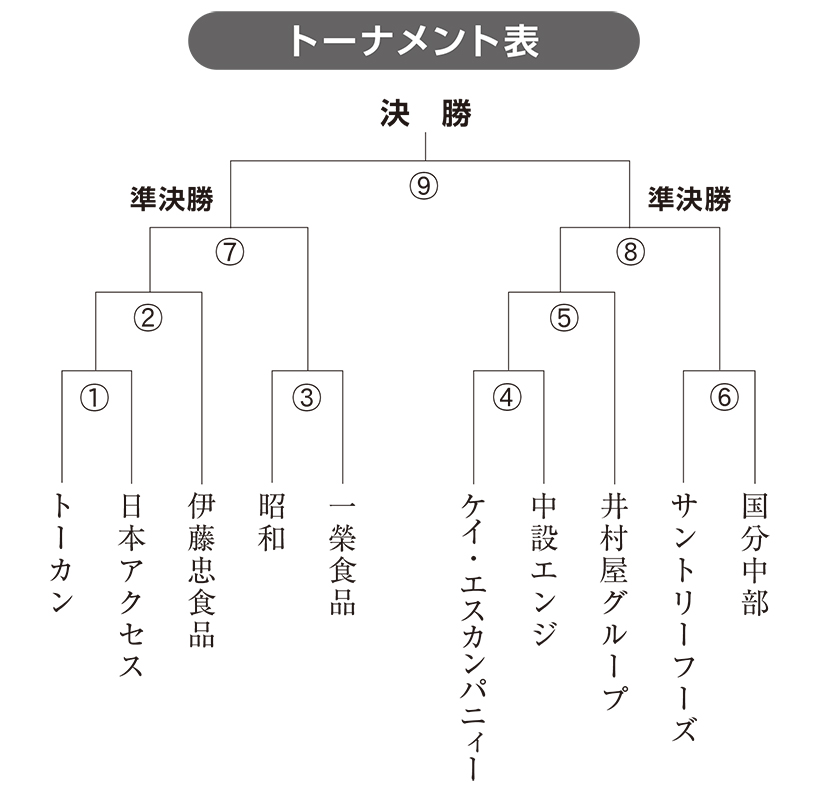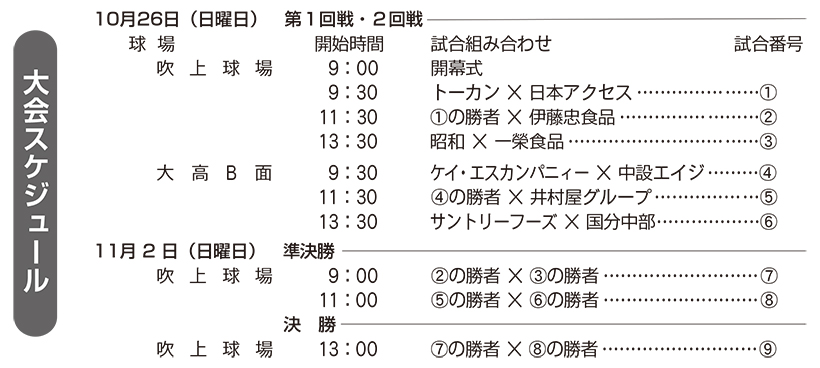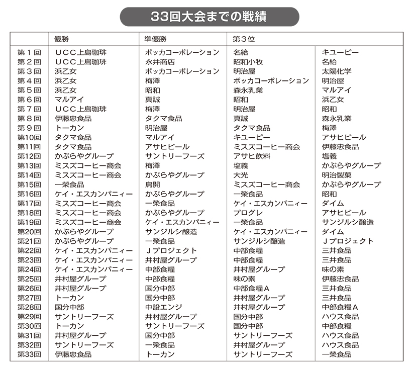 今大会には前回大会の決勝戦で25大会ぶりに優勝に返り咲いた伊藤忠食品のほか、トーカン、サントリーフーズ、一榮食品などの強豪チームが多く出場。また、3大会ぶりに日本アクセスも参戦。前回大会以上の盛り上がりが予想される。