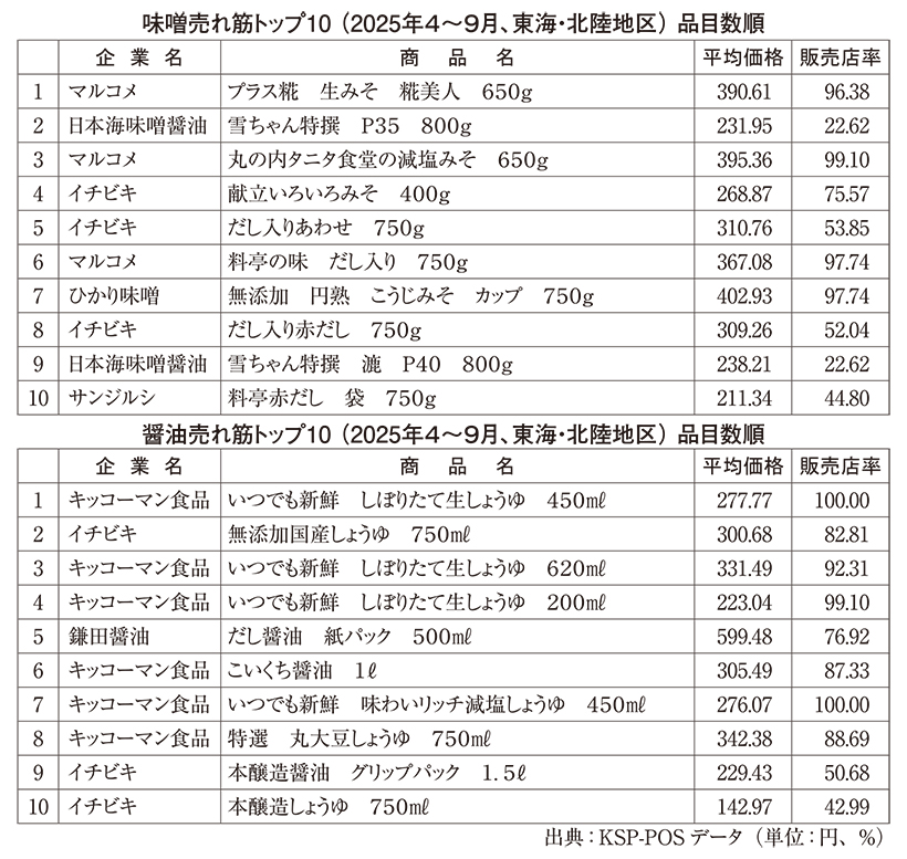 味噌売れ筋トップ10(2025年4~9月、東海・北陸地区)品目数順 / 醤油売れ筋トップ10(2025年4~9月、東海・北陸地区)品目数順